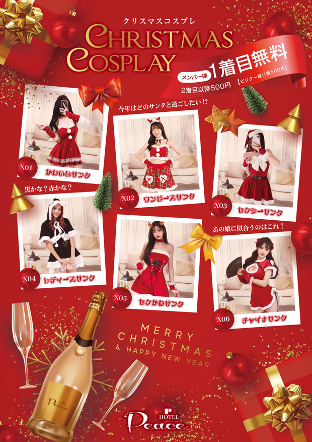 - 毎年大好評!ホテルピースのクリスマスコスプレ可愛いサンタになって二人だけのクリスマスを盛り上げちゃおう♡1着目は無料でレンタル可能です!詳しくは室内のメニューをご覧ください。